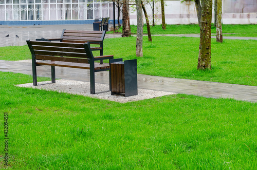 shining, waterdrop, seat, path, lawn, dripped, empty, modern, photo, black, rain, daytime, wet, walking, weather, grass, green, urban, nature, spring, brown, bench, park, covered, footpath, selective focus, no people, recreation area