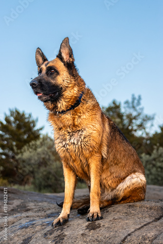 german, shepherd, dog, wet, rock, summer, nature, landscape, sitting, animal, pet, canino, breed, fur, domestic, outdoors, holiday, mammal, purebred, alert, portrait, brown, day, looking, tree, blue, sky, vertical, 1, no, people, front, view, side, colours, image, photo, away, close, up, wildlife, fauna, vertebrate, happy, playful, adventure, travel, freedom, peaceful