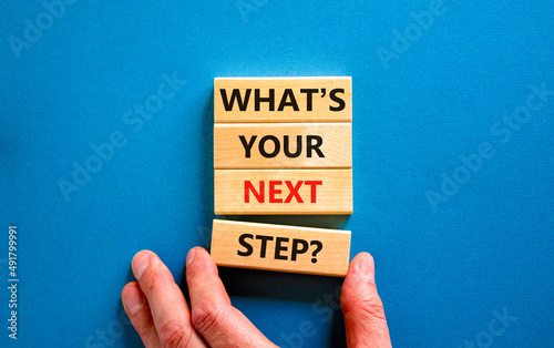 What is your next step symbol. Concept words What is your next step on blocks. Businessman hand. Beautiful blue table blue background. What is your next step business concept. Copy space.