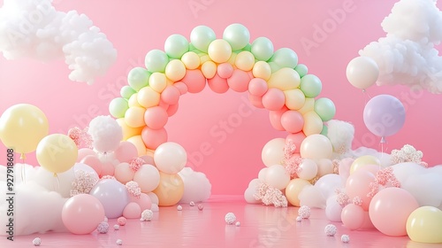 birthday, scene, whimsical, rainbow, arch, colourful, balloon, pink, fluffy, cloud, pastel, round, cluster, sphere, flower, decoration, glossy, floor, vibrant, party, celebration, decor, festive, cheerful, design, concept, event, playful, element, fun, joyful, happiness, creativity, imagination, atmosphere, children, children, surprise, gift, unique, charming, artistic, memorable, gathering, family, friends, seasonal