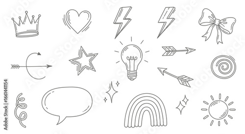 crown, nubes, lightning, bolt, bow, arrow, star, light bulb, sun, rainbow, speech, bubble, sparkle, spiral, creative, doodle, drawing, vignetting, icon, symbol, design, element, illustration, outline, simple, line, art, whimsical, graphic, iconography, set, collection, hand-drawn, hand, drawn, template, vector