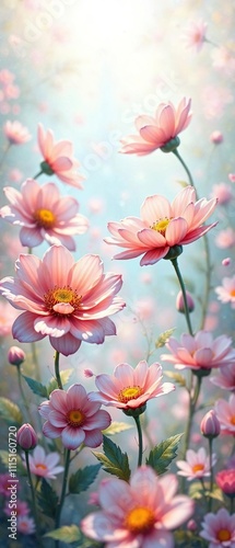 Whimsical hand-painted flowers in a dreamy, ethereal atmosphere, ethereal background, hand-painted flowers, ethereal quality