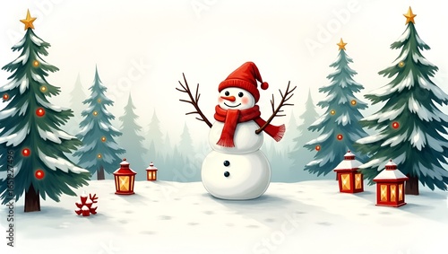 Whimsical hand-painted snowman with a carrot nose and cozy scarf, standing on snowy ground surrounded by fir trees, vintage illustration style.