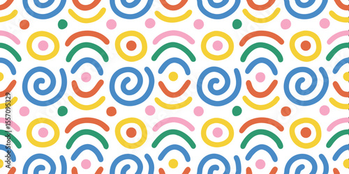 Whimsical Spiral Pattern: A vibrant, playful pattern of spirals and abstract shapes in a kaleidoscope of colors, offering a sense of fun and artistic expression.