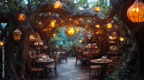 whimsical woodland caf where animals sip tea under lantern-lit branches and cakes float on magical plates, Generative AI