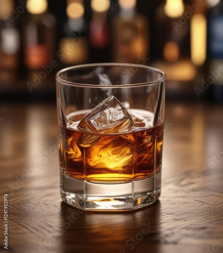 Whiskey glass on a wooden table with a blurred background to emphasize the glass , table, background