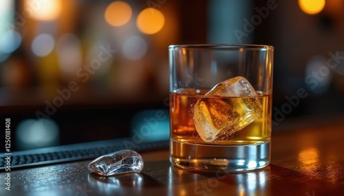Whiskey glass on wooden bar counter with ice cubes, bar, whiskey, wood