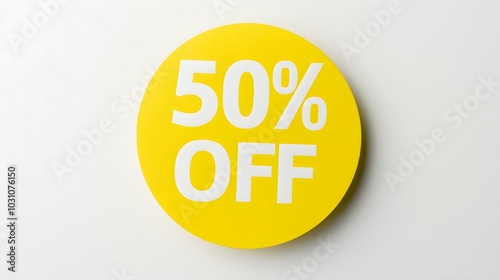 White '50% OFF' Text on a Yellow Round Paper Note. White Background with Copy Space