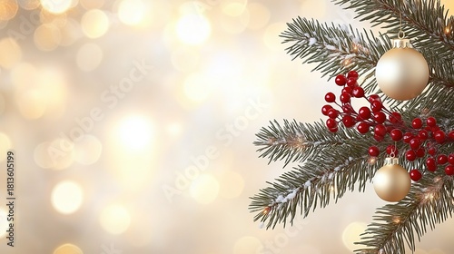 White and Gold Christmas Background with Elegant Pine Branches and Red Berries, Blurred Bokeh Lights, Design Banner for Presentation Template