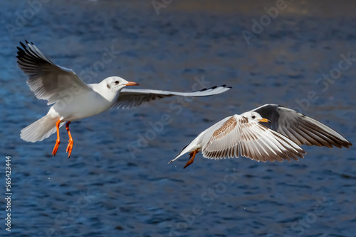 White and gray feathered gulls in flight with open wings over blue sky. acuatic birds. small birds. Close-up of a seagull.