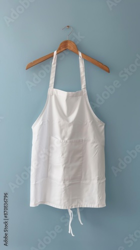 white, apron, wooden, hanger, blue, wall, studio, shot, minimalist, kitchen utensile, home, simple, clean, practical, fashion, apparel, household, domestic, clothes, cooking, accessory, wear, hanging, neat, organised, interior, cleaning, fabric, sleek, modern, plain, design