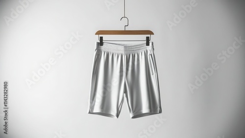 short, athletic, white, clothing, apparel, activewear, hanger, wooden, background, light, grey, fashion, style, summer, casual attire, gym, physical exercise, sport, textile, fabric, cotton, polyester, design, minimalist, simple, clean, template, product, advertisement, marketing, display, studio, photo, image, blank, neutral, modern, trendy, comfortable, pocket, elastic