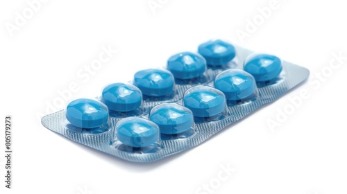 White background showcases blisters filled with blue pills, vivid and striking, Ai Generated.