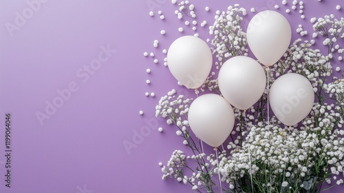 White balloons among delicate flowers on a pastel purple background create a festive atmosphere