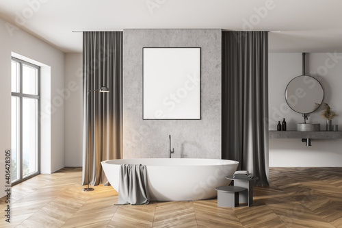 bathroom, interior, bathtub, sink, poster, white, beautiful, home, house, luxury, mirror, modern, shower, glasses, tub, wall, banner, up, copy, mock, space, window, three-dimensional, render, empty, nobody, illustration, concept, room, apartment, simple, stylish, minimalist, faucet, contemporary, decoration, style, wooden, estate, towel, residential, design, furniture, flat, floor, fancy, ceramic, elegant, bathe, architecture
