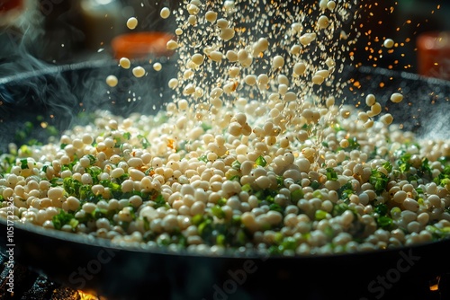 white, bean, green, onion, cooking, pan, fire, heat, food, kitchen, pot, wok, meal, steam, smoke, black, kitchen utensile, culinary, ingredient, favor, savoury, stir, fries, hot, utensil, burner, stove, preparation, delicious, tasty, healthy, fresh