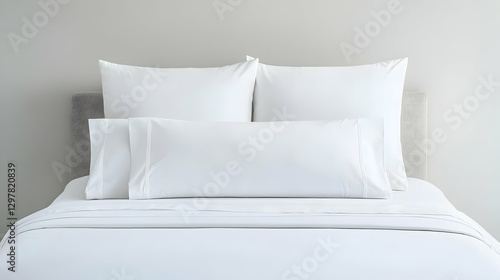 White Bedding And Pillows Arranged Neatly On Bed Against A Gray Wall