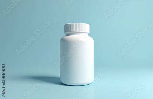 White blank plastic medicine bottle with screw cap stands on clean blue background. Container ready for pills vitamins supplements medication or drugs. Pharmaceutical packaging product.