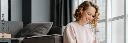 panorama, panoramic, cropped, woman, adult, young, white, home, smartphone, use, mobile, to sit, phone, couch, floor, mobile phone, laugh, smile, blond, indoor, day, 1, people