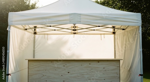 tent, canopy, white, plywood, counter, structure, frame, outdoors, sunlit, background, empty, tabletop, wood, temporary, event, party, market, fair, trade, shelter, awning, portable, collapsible, construction, rectangle, support, bracing, post, leg, field, nature, sunlight, bright, blank, neutral, simple, minimalist, setup, space, open, seller, display, showcase, surface, stage, exhibition, presentation, assembly