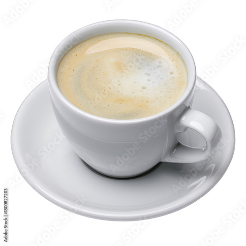 White ceramic cup filled with frothy coffee served on a matching saucer isolated on a transparent background with soft lighting highlighting the beverage