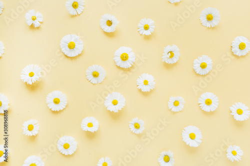 White chamomile daisy flowers pattern on yellow background. Flat lay, top view minimal floral composition.