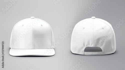 White classic snapback front and back in pure white without logo on grey background as a design mockup