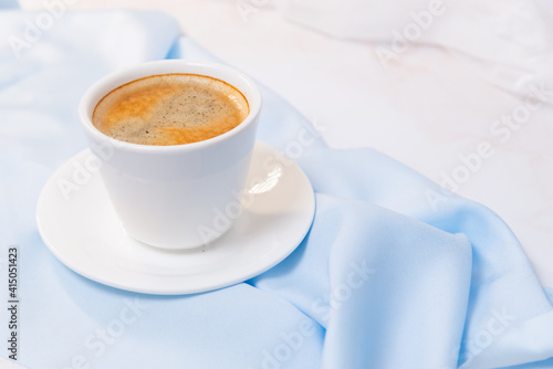 white cup of coffee on blue cloth