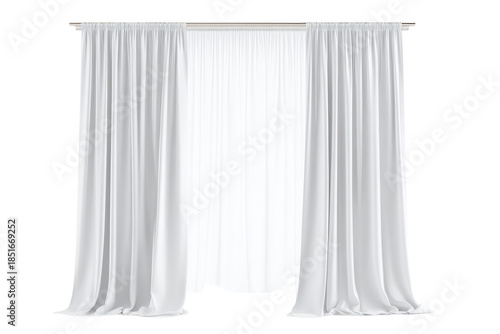 White curtains hang in a simple room with a light background allowing some sunlight to enter and provide natural light