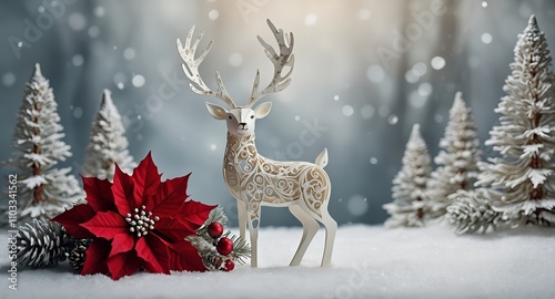 White decorative reindeer surrounded by red poinsettia flowers, pinecones, and snow-covered trees on a snowy background.