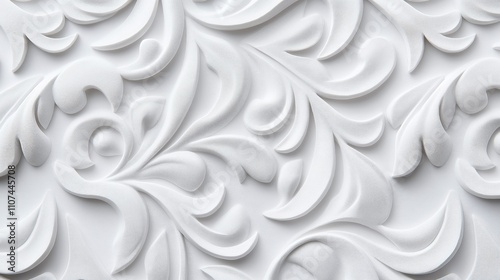 White embossed decorative pattern with abstract floral motifs and curved shapes on a textured surface background