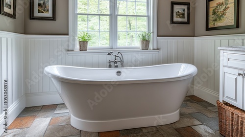 White Freestanding Bathtub with Chrome Faucet in a Modern Bathroom