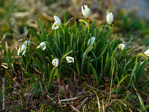 White galanus buds on green stems on spring day