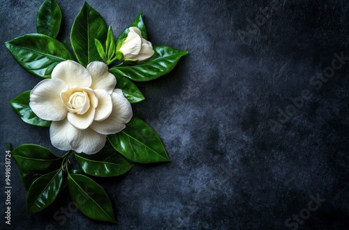 White Gardenia Flower with Green Leaves on a Dark Background