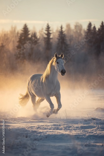 White horse galloping through snowy field at golden winter sunrise with flowing mane and misty frost. Majestic freedom run, inspiring cold season dawn vibe full of power and serenity.