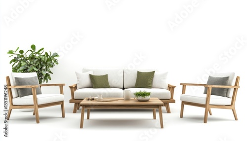 White living room interior with a wooden coffee table, sofa, and armchair in a Scandinavian style