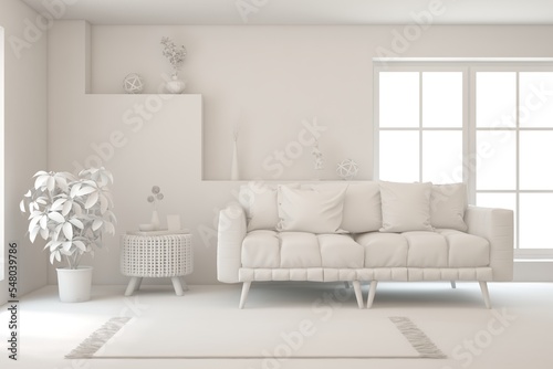 White minimalist living room with sofa. Scandinavian interior design. 3D illustration