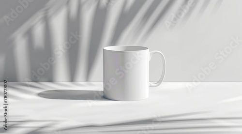 White mug mockup on light background with shadows. White mug mockup on wooden table with window and plant in background. Closeup view, copy space for design or print presentation, blank coffee cup