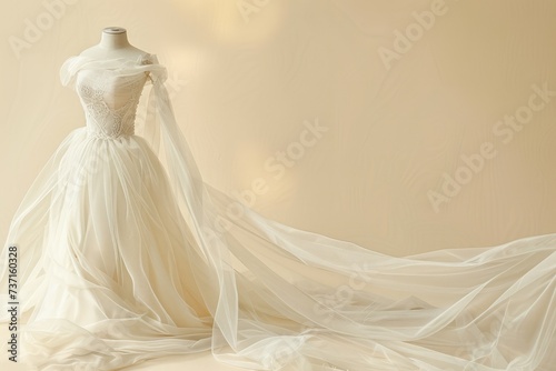 White pastel designed art fashioned Wedding dress silk and embroidery is on dummy over beige background with copy space