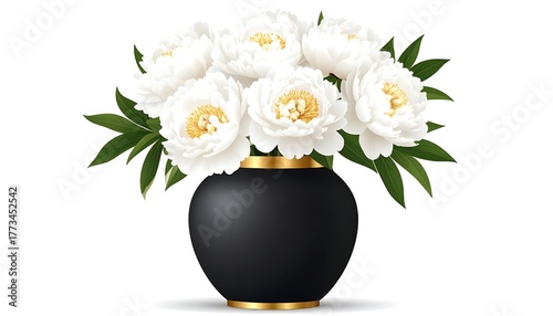 peony, flower, white, vase, black, gold, bouquet, floral, nature, decoration, beautiful, elegant, bloom, spring, summer, isolated, gift, design, artwork