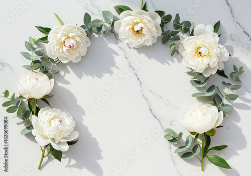 flower, peony, floral, white, eucalyptus, marble, arrangement, spring, nature, wedding, decoration, background, botanical, elegant, still life, minimal, topview, beautiful, decorative, flora, plant, bloom, fresh, copy space