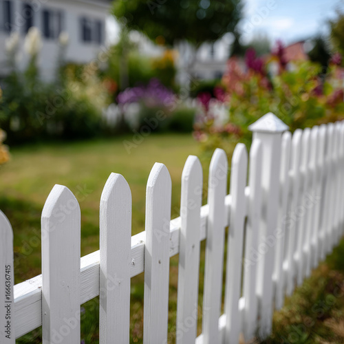 White picket fence in a sunny garden with flowers and lawn.