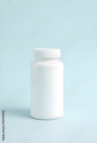 White pill bottle, minimalist composition, light blue background, pharmaceutical, clean aesthetic, studio lighting