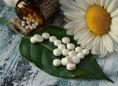 White Pills on Green Leaf with Daisy Flower and Medicine Bottle