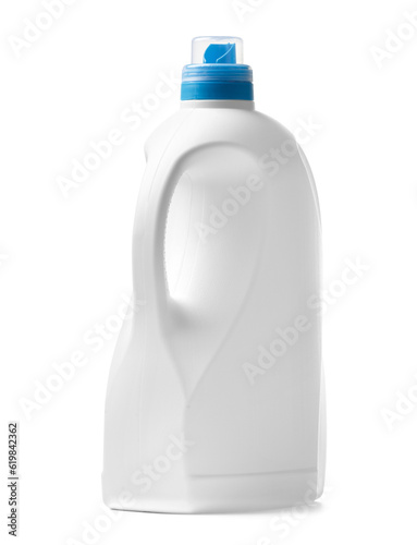 White plastic bottle for liquid detergents, laundry bleaching, fabric softener, isolated on white background.