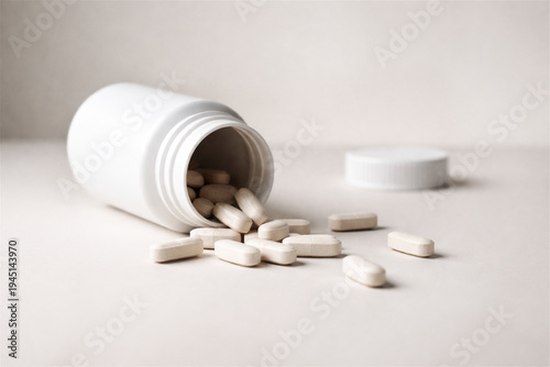 white plastic pill bottle tipped on its side spilling oblong tablets and capsules across a clean light surface, cap behind, studio-style minimal healthcare still life