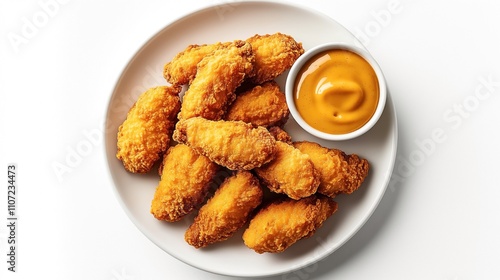 White plate filled with crispy fried chicken wings accompanied by a small bowl of creamy orange dipping sauce