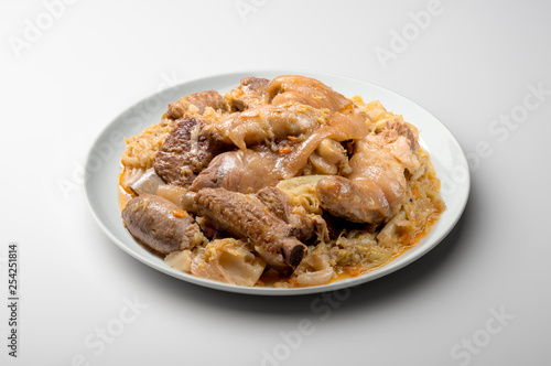 White plate with pork meat and savoy cabbage