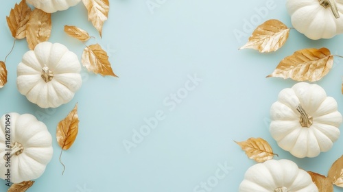 pumpkin, white, autumn, fall, leaf, gold, gilded, pastel, blue, background, design, decor, decoration, harvest, thanksgiving, october, seasonal, elegant, minimalist, simple, arrangement, overhead, top, view, image, photo, picture, holiday, celebration, beauty, nature, colours, texture, style, sophisticated, cosy, rustic