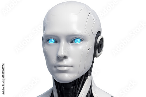 White robot head with glowing blue eyes on transparent background representing artificial intelligence and future technology
